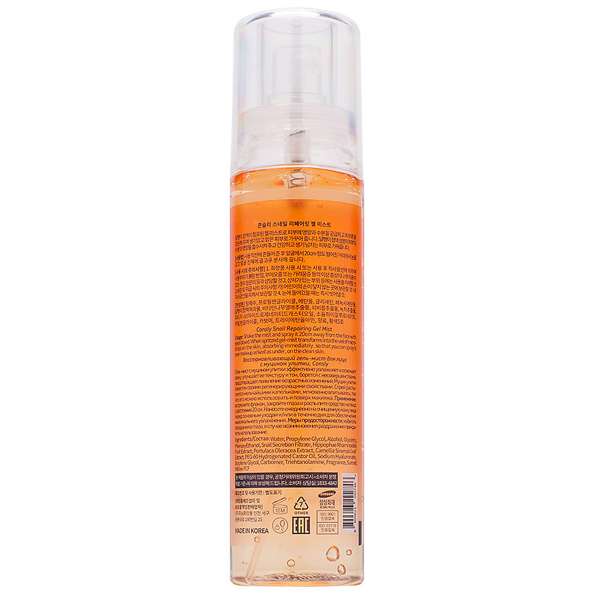 Гель-мист с муцином улитки эффективно увлажняет и освежает кожу, улучшает ее текстуру и тон, борется с несовершенствами, предотвращает появление возрастных изменений. Муцин улитки известен своими регенерирующими свойствами. Спрей распыляется мельчайшими капельками, мгновенно впитывается, поэтому его можно использовать и поверх макияжа.