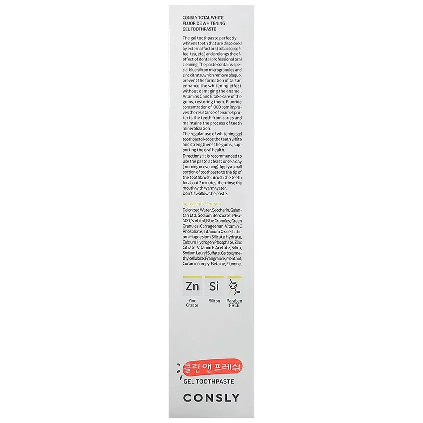 Гелевая зубная паста идеально подходит для отбеливания зубов, изменение цвета которых вызвано внешними факторами (табак, кофе, чай т.д.). Паста содержит специальные синие микрогранулы из кремния и цитрат цинка, которые удаляют зубной налет, предотвращают образование зубного камня, усиливают эффект отбеливания, при этом не повреждая эмаль.