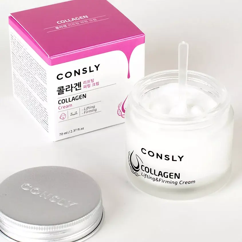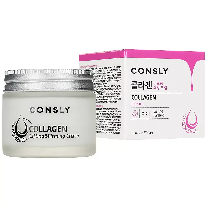 Лифтинг-крем для лица с колллагеном Consly предназначен для укрепления овала лица и борьбы с признаками старения. Продукт обладает комфортной консистенцией, которая мгновенно впитывается, возвращая коже ощущение комфорта. Формула средства сочетает коллаген, гиалуроновую кислоту, масла виноградной косточки, ши, аллантоин, пантенол, а также экстракты центеллы азиатской и гамамелиса.