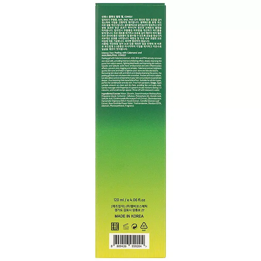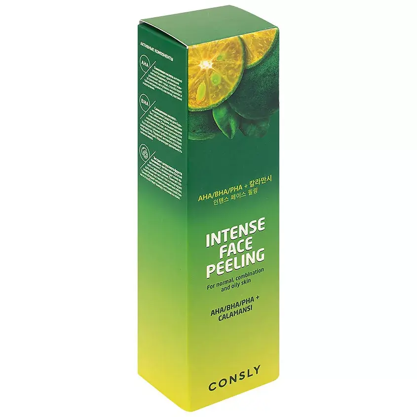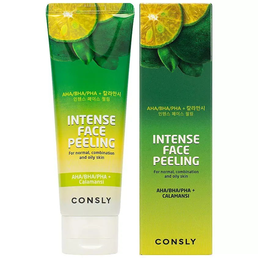 Гель с экстрактом каламанси, AHA и BHA кислотами интенсивно отшелушивает ороговевшие клетки кожи, глубоко очищая поры от избытков себума, осветляет черные точки, улучшает текстуру кожи.