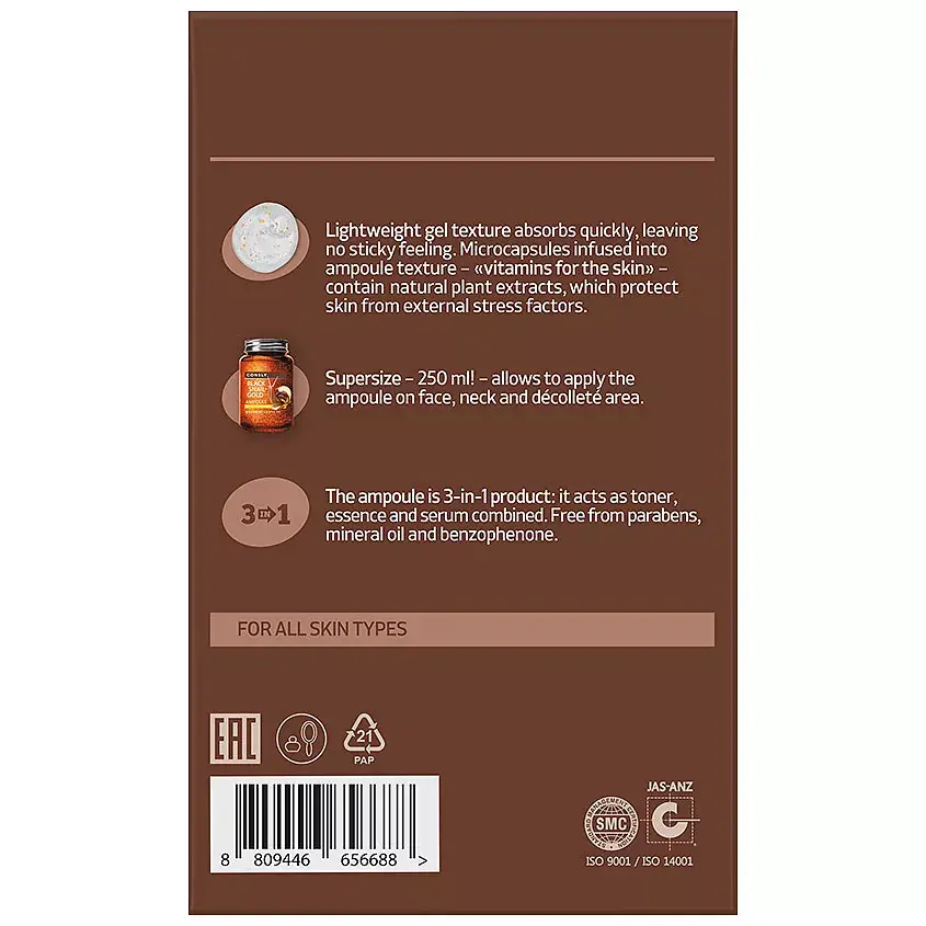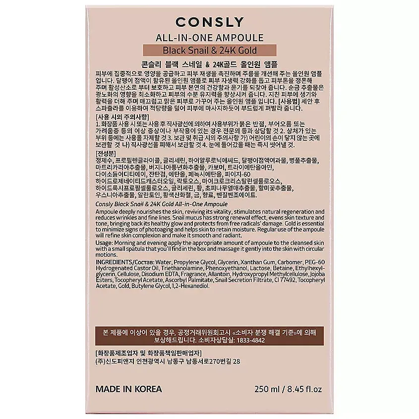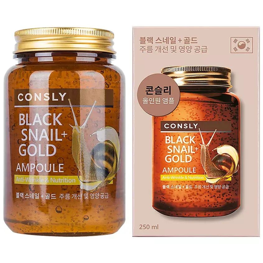 Ампульная сыворотка интенсивно питает кожу, наполняет ее энергией и жизненной силой, стимулирует регенерацию и сокращает морщины. Муцин улитки оказывает мощное обновляющее воздействие на кожу, выравнивает ее рельеф и тон, защищает от воздействия свободных радикалов, возвращает здоровое сияние. Золото минимизирует последствия фотостарения и помогает коже удерживать влагу. Регулярное использование сыворотки позволит значительно улучшить текстуру кожи, сделать ее более гладкой и сияющей.