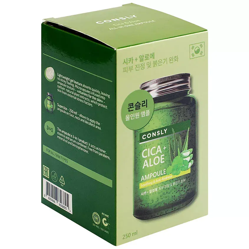 Ампульная сыворотка эффективно успокаивает кожу, устраняет шелушения и иные несовершенства, дарит чувство комфорта чувствительной коже. Экстракт центеллы азиатской обладает выраженными регенерирующими свойствами, снимает, снижает негативное влияние ультрафиолета, ветра, высоких или низких температур. Экстракт алоэ оказывает ярко выраженное успокаивающее и увлажняющее воздействие, быстро устраняет обезвоживание и чувство стянутости. Регулярное использование сыворотки позволит коже поддерживать оптимальный уровень увлажненности, противостоять факторам внешнего стресса и сохранить молодость и гладкость.