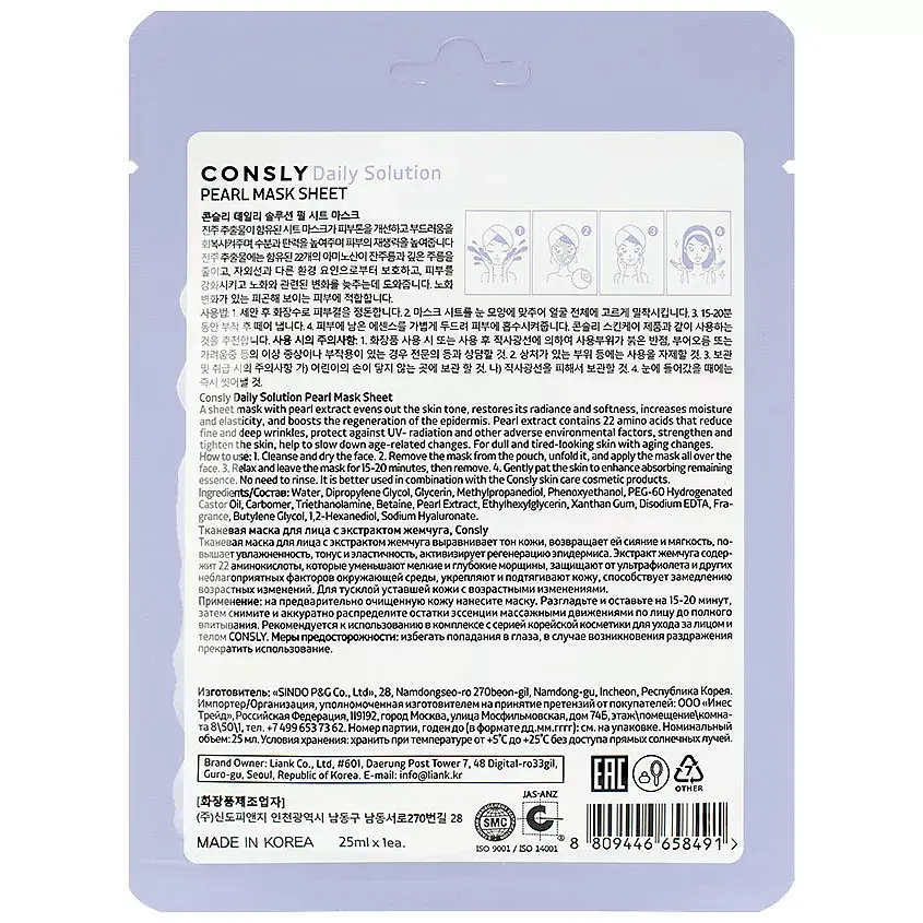 На предварительно очищенную кожу нанесите маску. Разгладьте и оставьте на 15-20 минут, затем снимите и аккуратно распределите остатки эссенции массажными движениями по лицу до полного впитывания. Рекомендуется к использованию в комплексе с серией корейской косметики для ухода за лицом и телом CONSLY.