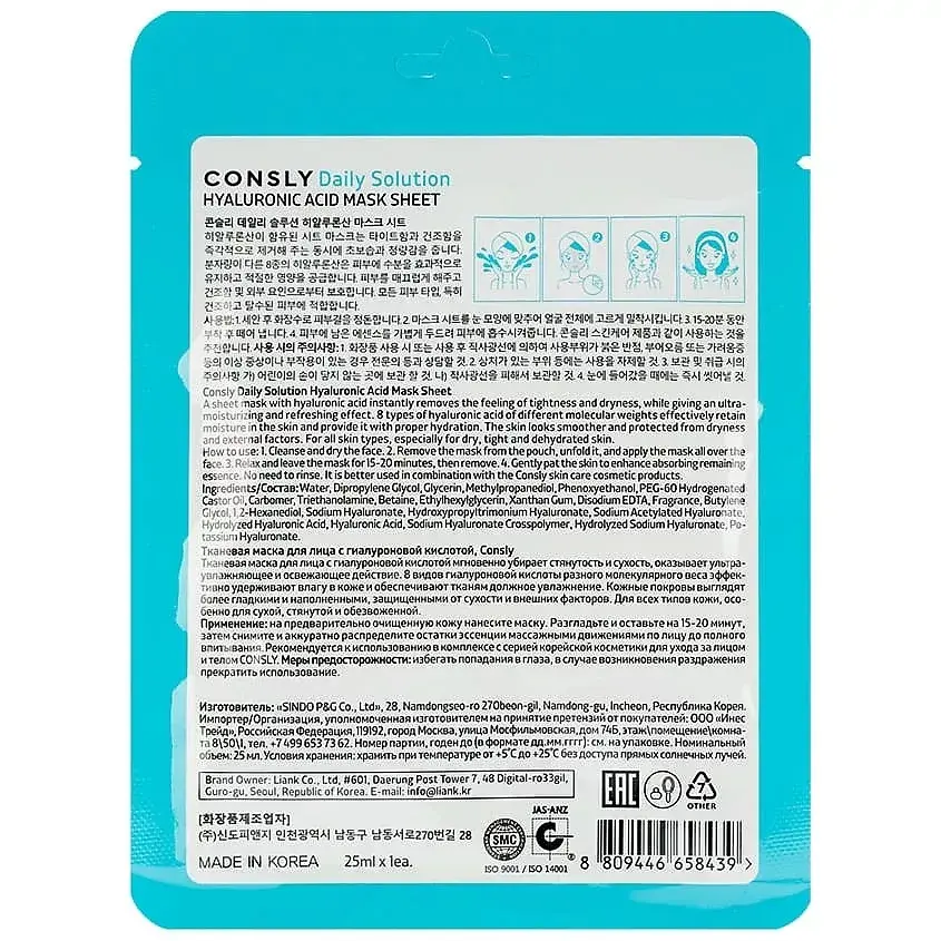 На предварительно очищенную кожу нанесите маску. Разгладьте и оставьте на 15-20 минут, затем снимите и аккуратно распределите остатки эссенции массажными движениями по лицу до полного впитывания. Рекомендуется к использованию в комплексе с серией корейской косметики для ухода за лицом и телом CONSLY.