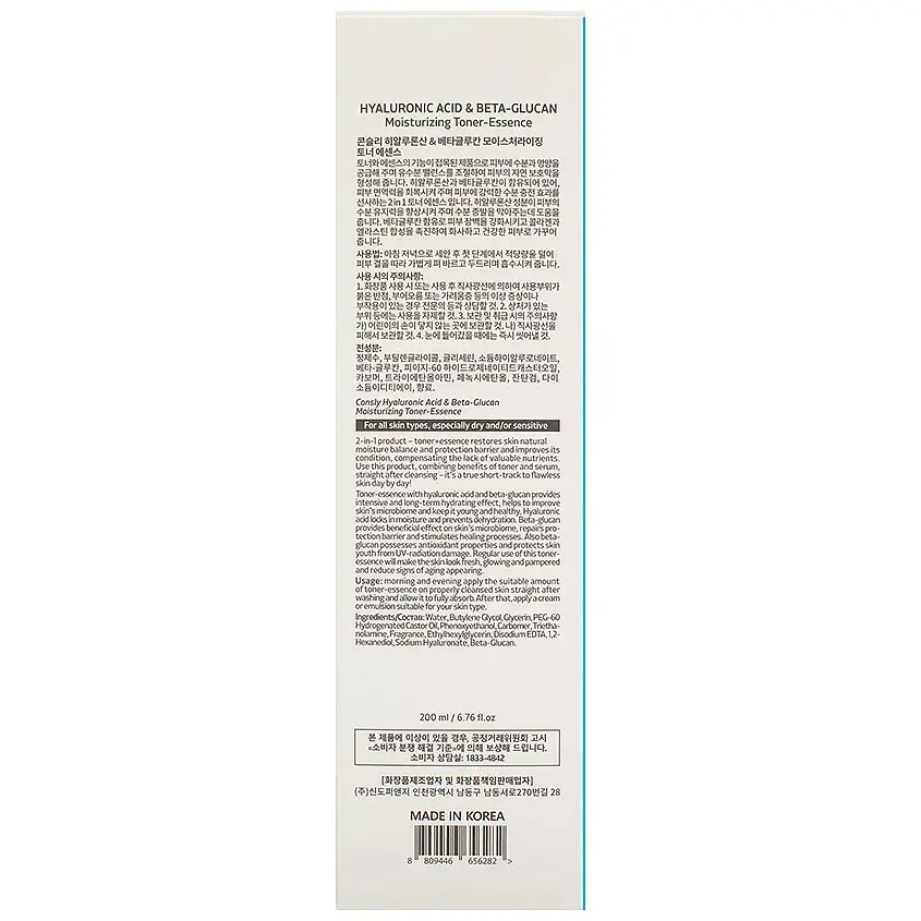 Тонер-эссенция с гиалуроновой кислотой и бета-глюканом оказывает интенсивное и продолжительное увлажняющее воздействие на кожу, восстанавливает ее естественный баланс и сохраняет молодость. Гиалуроновая кислота удерживает влагу в коже и предотвращает обезвоживание. Бета-глюкан активно восстанавливает кожу, укрепляет ее защитный барьер, действует как мощный антиоксидант и стимулирует синтез коллагена и эластина. Регулярное применение тонера-эссенции быстро вернет коже свежий и ухоженный вид, защитит от факторов внешнего стресса, сократит проявления возрастных изменений.
