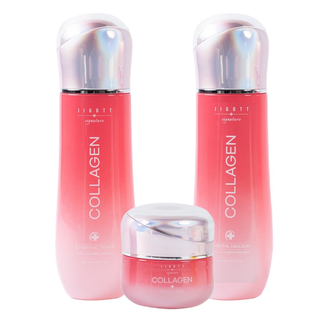 Набор для лица с коллагеном JIGGOT Signature Collagen Essential Skin Care 3set (3 предмета + 2 мини-версии) подарит вашей коже длительное увлажнение, питание и глубокий уход, предотвратит появление морщин и поможет коже наполниться жизненными силами. В результате использования значительно улучшается цвет лица, разглаживаются морщины, укрепляется кожный барьер. Коллаген в составе великолепно питает кожу, возвращает её упругость и эластичность. Антиоксидантный комплекс помогает улучшить тонус кожи, эффективно защищает клетки кожи от повреждающего действия свободных радикалов и замедляет процессы старения.