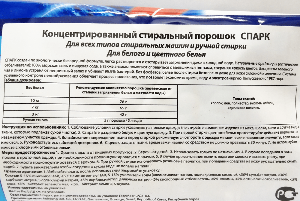 Концентрированный стиральный порошок Спарк очень экономичен. При загрузке 7 кг белья упаковки хватит на 46 стирок, а при загрузке 3 кг белья – на 70 стирок!
