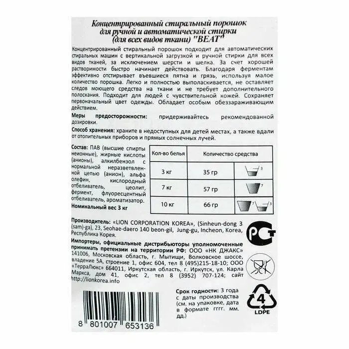 Способ применения: ознакомьтесь с информацией, указанной на ярлыке изделий. Для ручной стирки используйте 5 г. порошка на 5 л. воды.