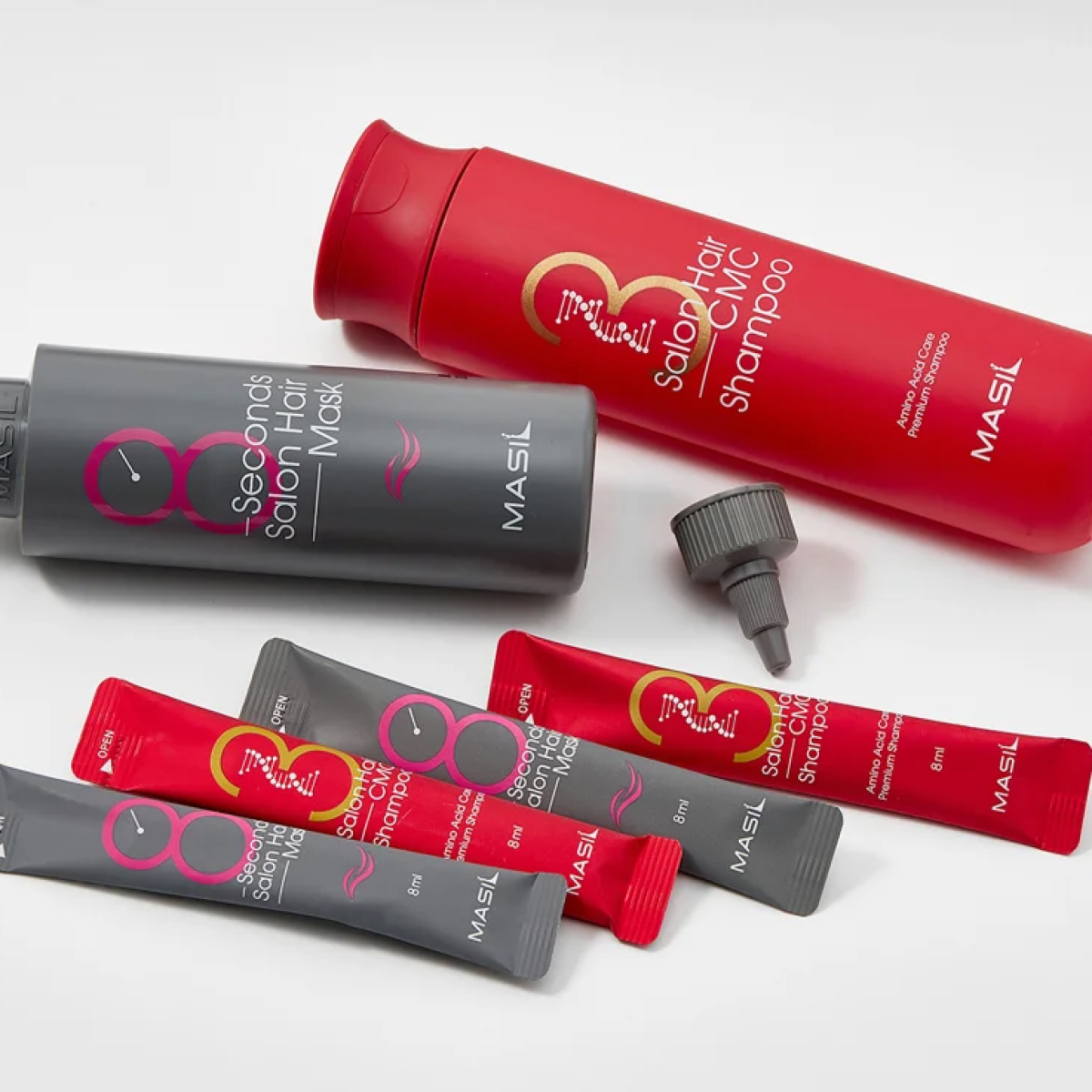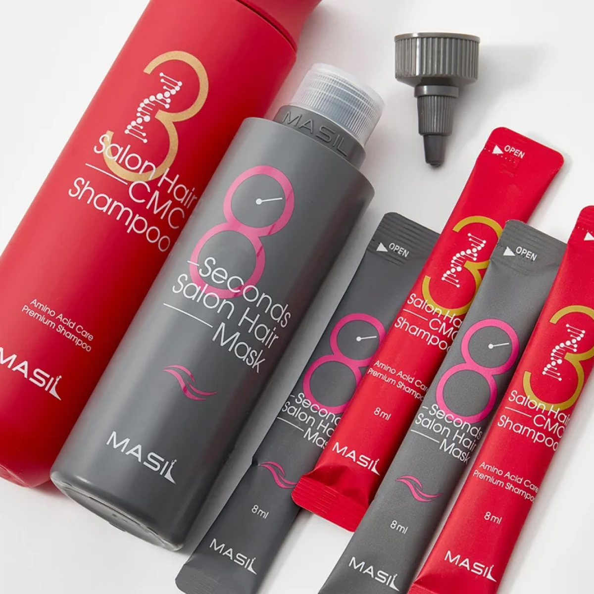 Masil 3 Salon Hair CMC Shampoo (300 мл + 2 саше по 8 мл) — шампунь с аминокислотами. Глубоко увлажняет волосы, не утяжеляя их, придает блеск, здоровый вид и способствует улучшению роста волос. Шампунь питает волосы, устраняет выпадение, обеспечивает гладкость и шелковистость. В состав входит 17 аминокислот, которые заполняют пористость волоса, делая их более плотными без утяжеления. Комплекс керамидов питает волосы, устраняет ломкость, препятствует появлению секущихся кончиков. Для всех типов волос.