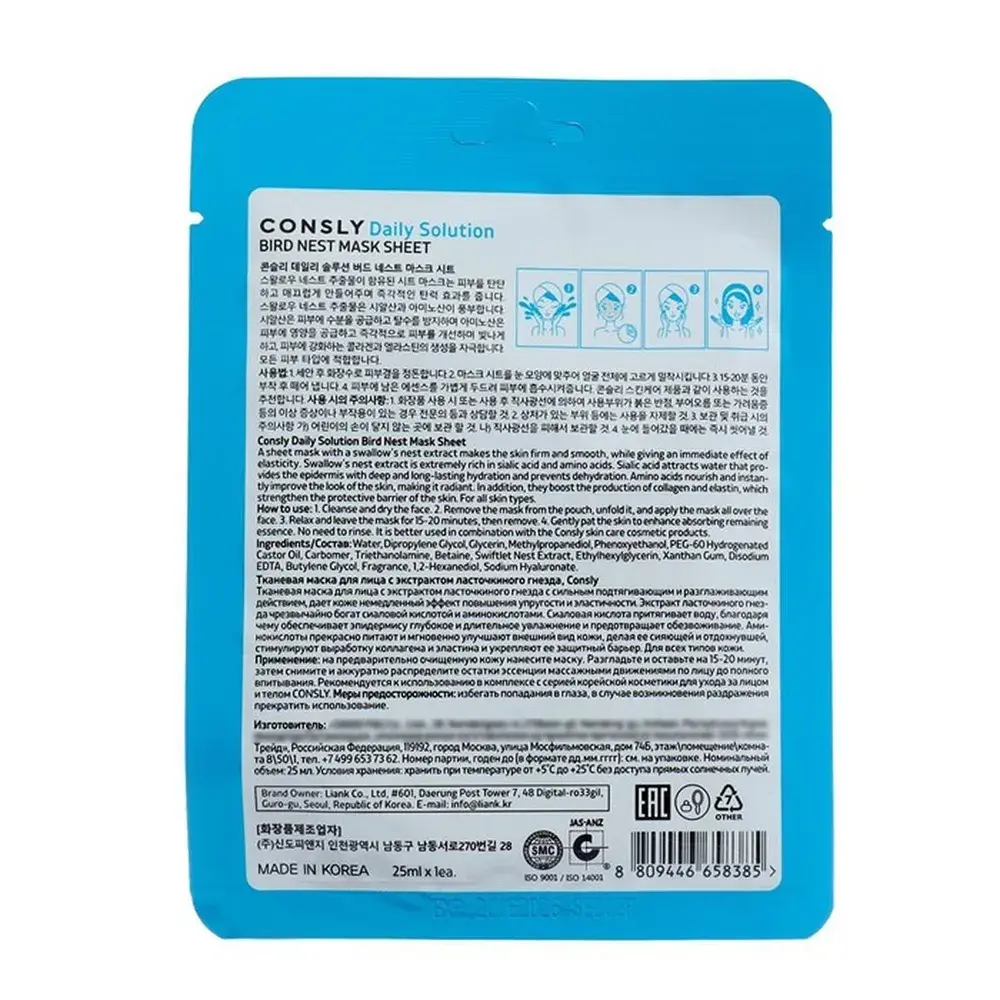 Тканевая маска с экстрактом ласточкиного гнезда оказывает выраженное омолаживающее воздействие: делает неровности и несовершенства менее заметными, уменьшает глубину имеющихся морщин, делает цвет лица равномерным.