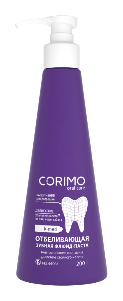 Отбеливающая зубная паста-флюид Corimo с гидроксиапатитом «Эффект цветокоррекции» – это эффективное средство для комплексного ухода за зубами и деснами. Паста предотвращает потемнение поверхности эмали, образование неприятного запаха и деминерализацию, что снижает риск развития кариеса. Благодаря расщеплению налета и разрушению твердых белковых структур отложений, паста обеспечивает эффективную профилактику проблем с деснами и возникновения неприятного запаха изо рта. Одним из ключевых преимуществ пасты является наличие в составе гидроксиапатита. Этот компонент органически заполняет микрополости и трещинки эмали, запуская процесс восстановления костной ткани. Это обеспечивает долгосрочный эффект и способствует сохранению здоровья зубов и десен. Фиолетовый корректор-цветовой модификатор, входящий в состав пасты, нейтрализует желтый оттенок зубного налета. Таким образом, зубы становятся визуально более белыми, что придает улыбке естественную белизну и свежесть. Отбеливающая зубная паста-флюид Corimo с гидро